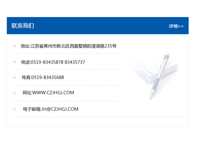 傳真:0519-83435688    郵編:213135    網址:WWW.czjhgj_com.lexin1688.com    電子郵箱:JH@czjhgj_com.lexin1688.com